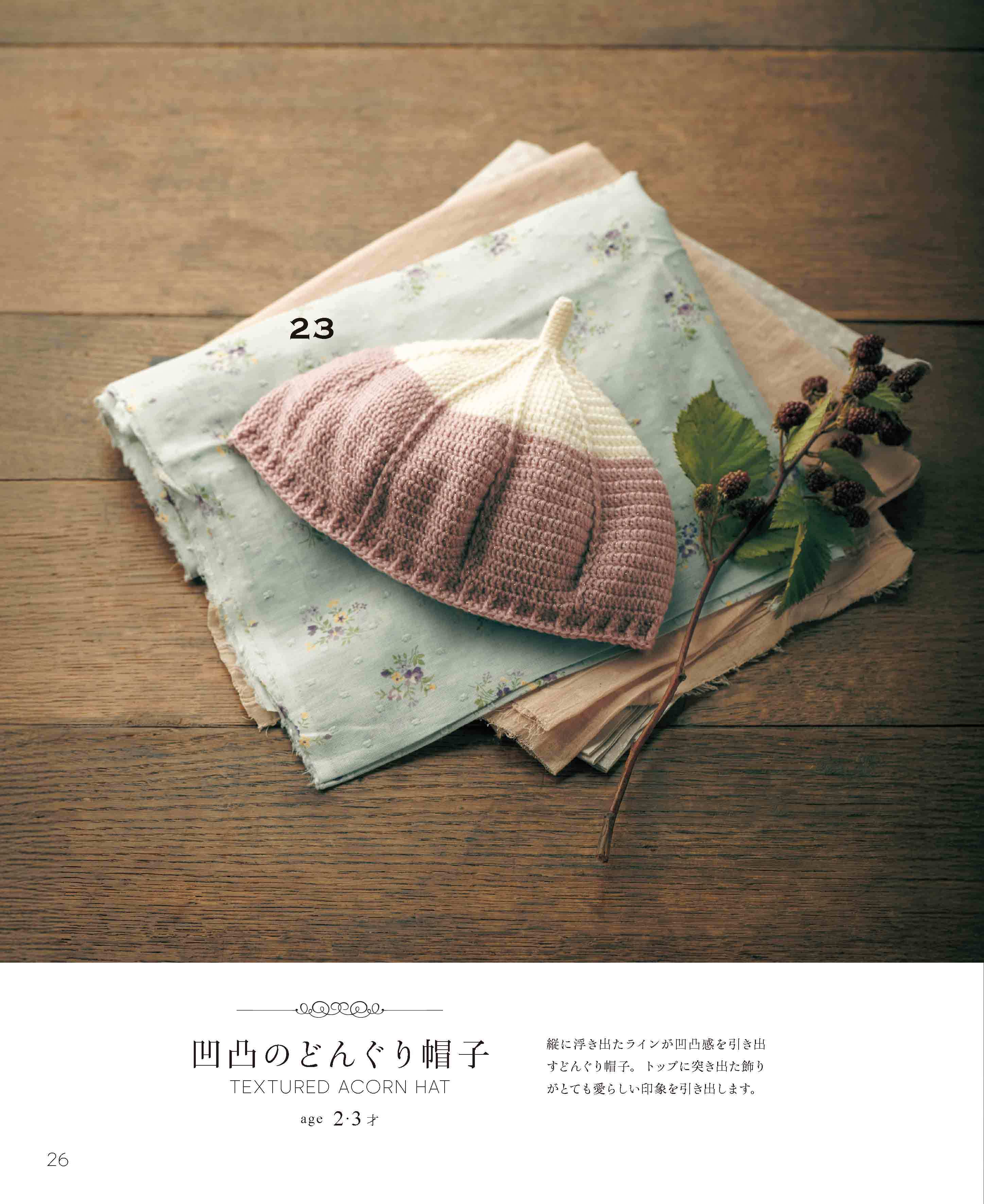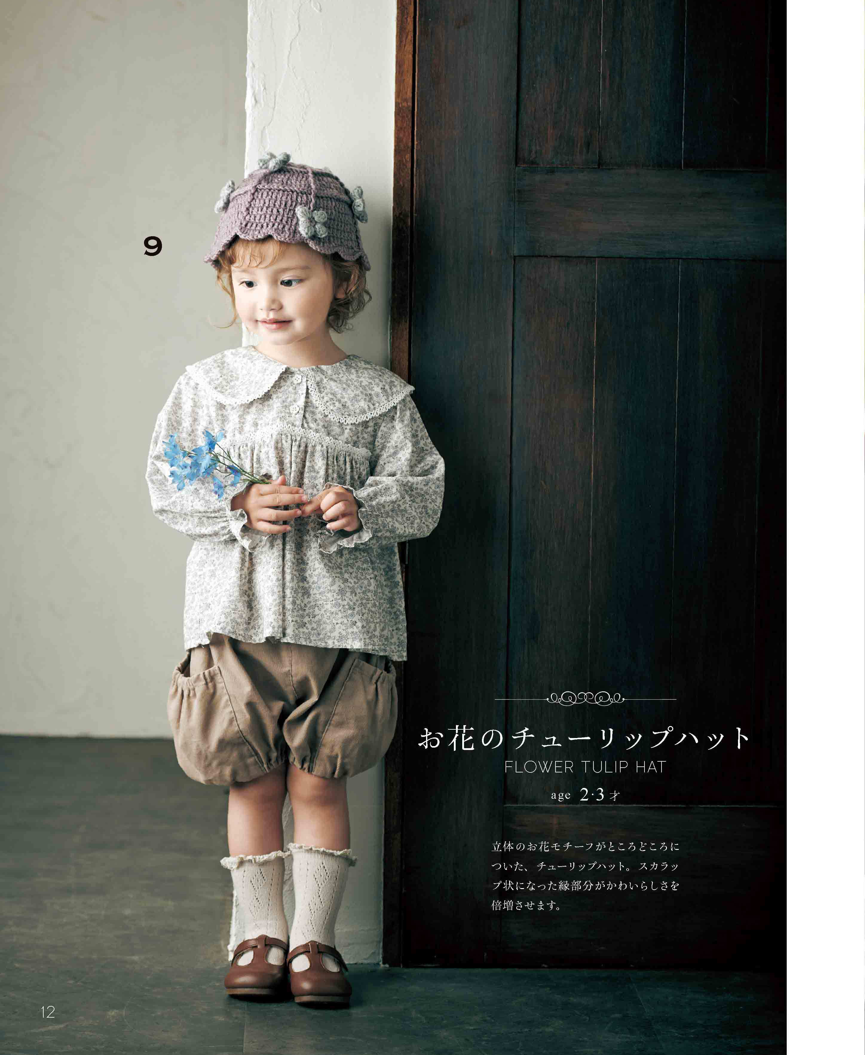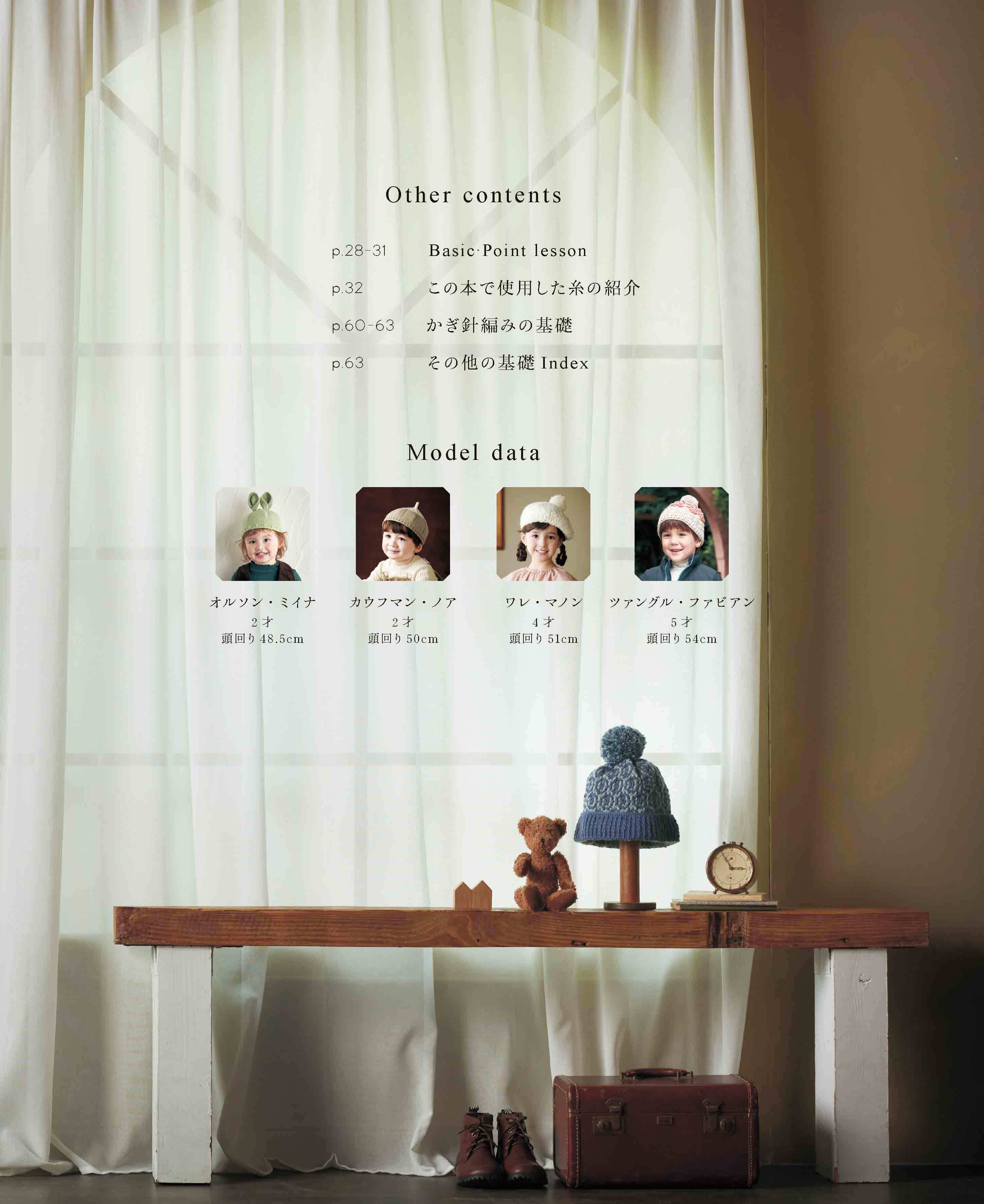 2〜5才の子供に向けた、かぎ針で編む子供の帽子を集めた作品集。作品は、ステッチベレー帽、フリルのブリム帽子、モチーフつなぎの頭巾帽子から、子供に人気の動物を表現したラビットの帽子とライオンの帽子、かわいらしいデザインが特徴の凹凸のどんぐり帽子までデザイン豊富にご紹介。全体的に彩り豊かな色で展開しているので、様々な系統のファッションスタイルでも合わせやすく、冬の防寒対策にもなるおすすめの一冊です。この本で使用した編み目記号とその編み方の基礎なども詳しく解説。また、初心者の方でも安心して取り組めるよう、写真でのポイントレッスンつき。