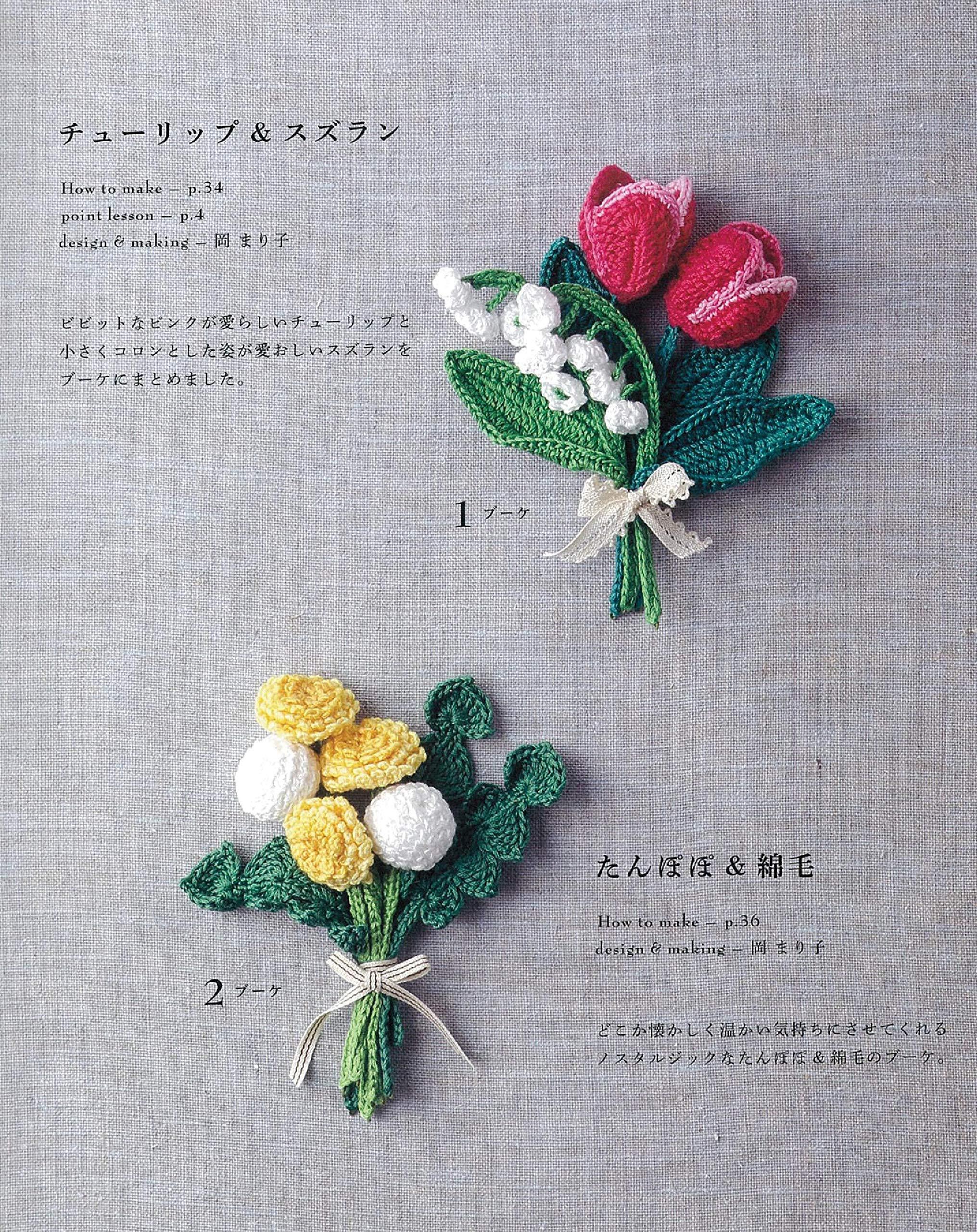 アイテムとしては、ツルバラ、リーフ、スミレなどのモチーフを使用したアクセサリーから、ポピー、ラベンダーなどのコサージュ、フラワーブックマーカー、フラワーモチーフ付き巾着ポーチなどのこものやアイリッシュフラワー&リーフのドイリーまでバリエーション豊かに計65点を紹介。