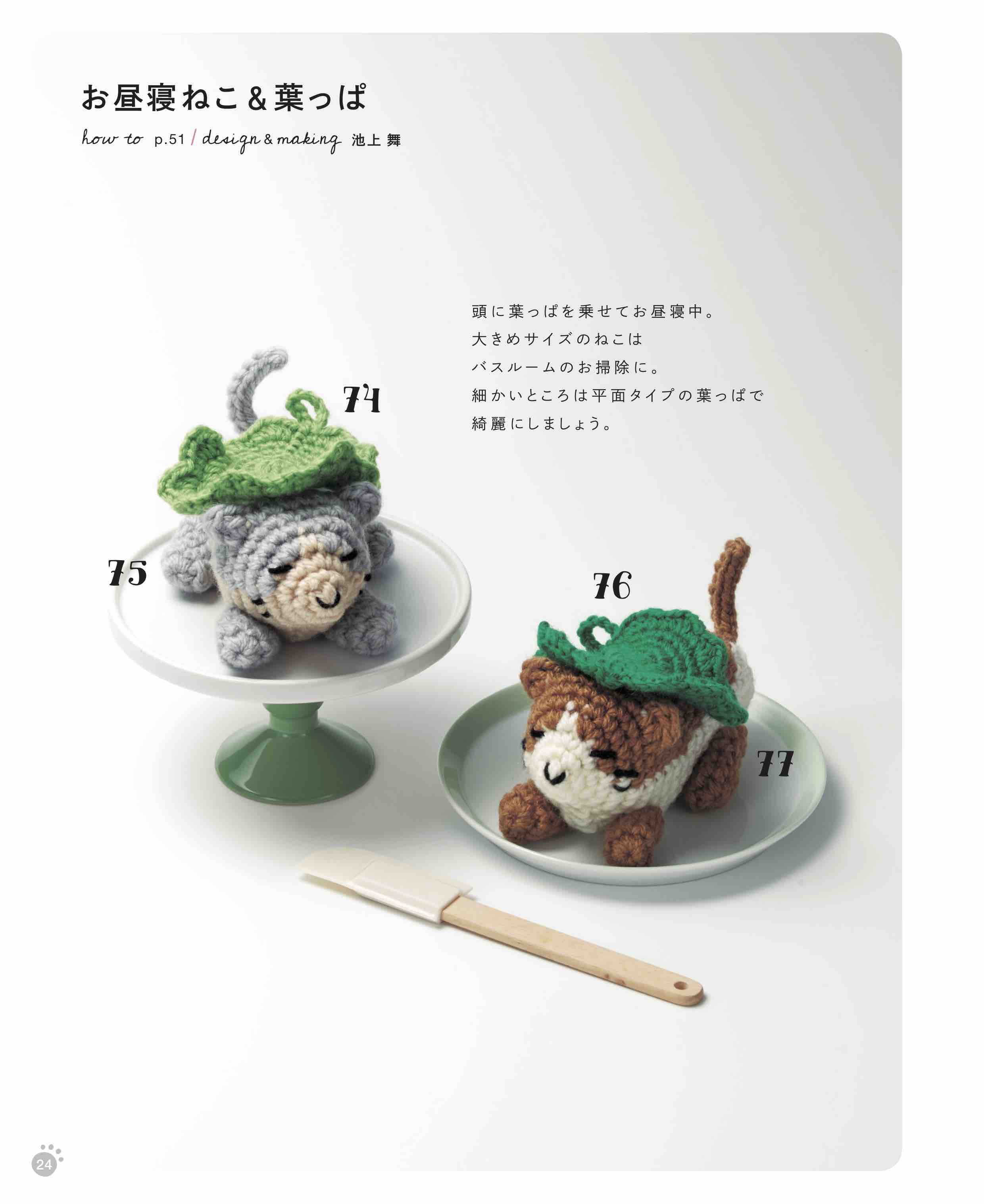 今回は手早く編める平面のたわし、しっかりごしごし洗える立体のたわし、スティックタイプのミニブラシ、ミニチュアクリーナーなど100点を掲載。作品は、日常の愛らしい姿(おすわりねこ、寝姿、じゃれるねこなど)の立体的なもの、また、ねこそのものだけでなく、ねこじゃらし、さかな、ねずみのおもちゃなど、ねこに関わるモチーフも紹介。かわいいたわしは実用的なのはもちろん、インテリアとしても楽しめる一冊。