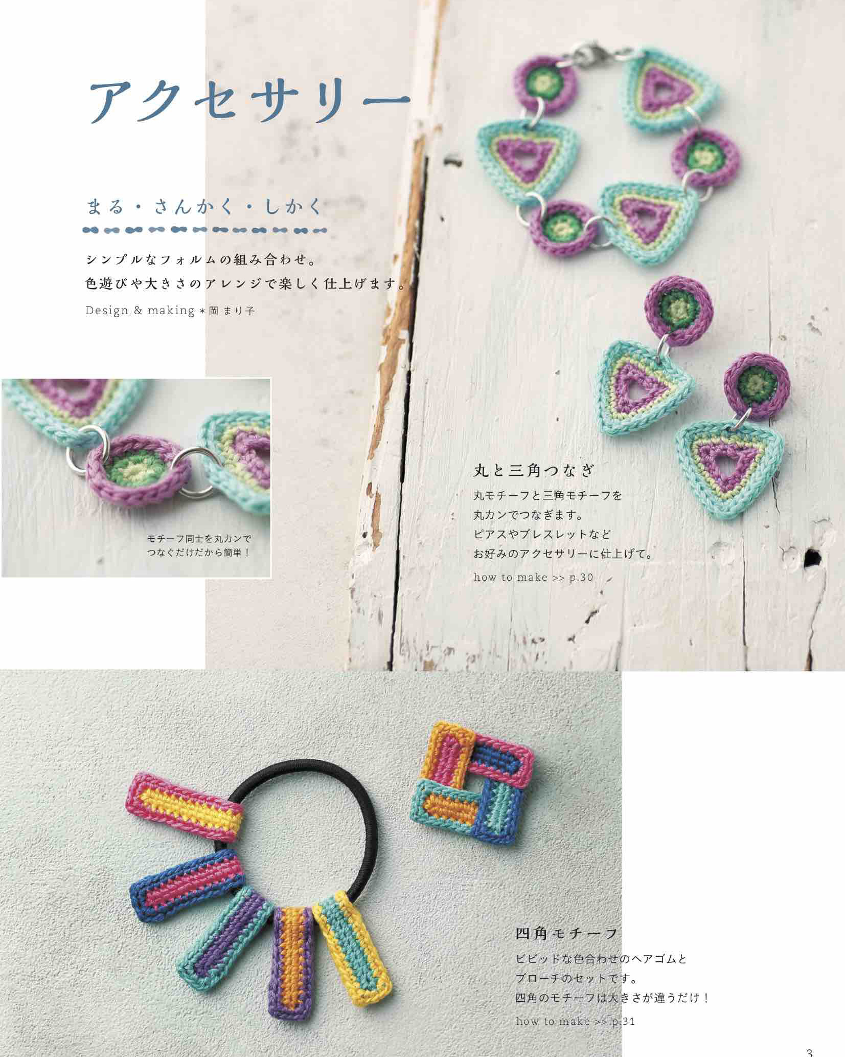 春夏に向けて向けて簡単に作れる髪飾りやアクセサリー、手軽に持ち歩けるかわいいポーチ&巾着などのほか、合間にcolumnとして、新しいジャンルのミニ織物などを紹介。