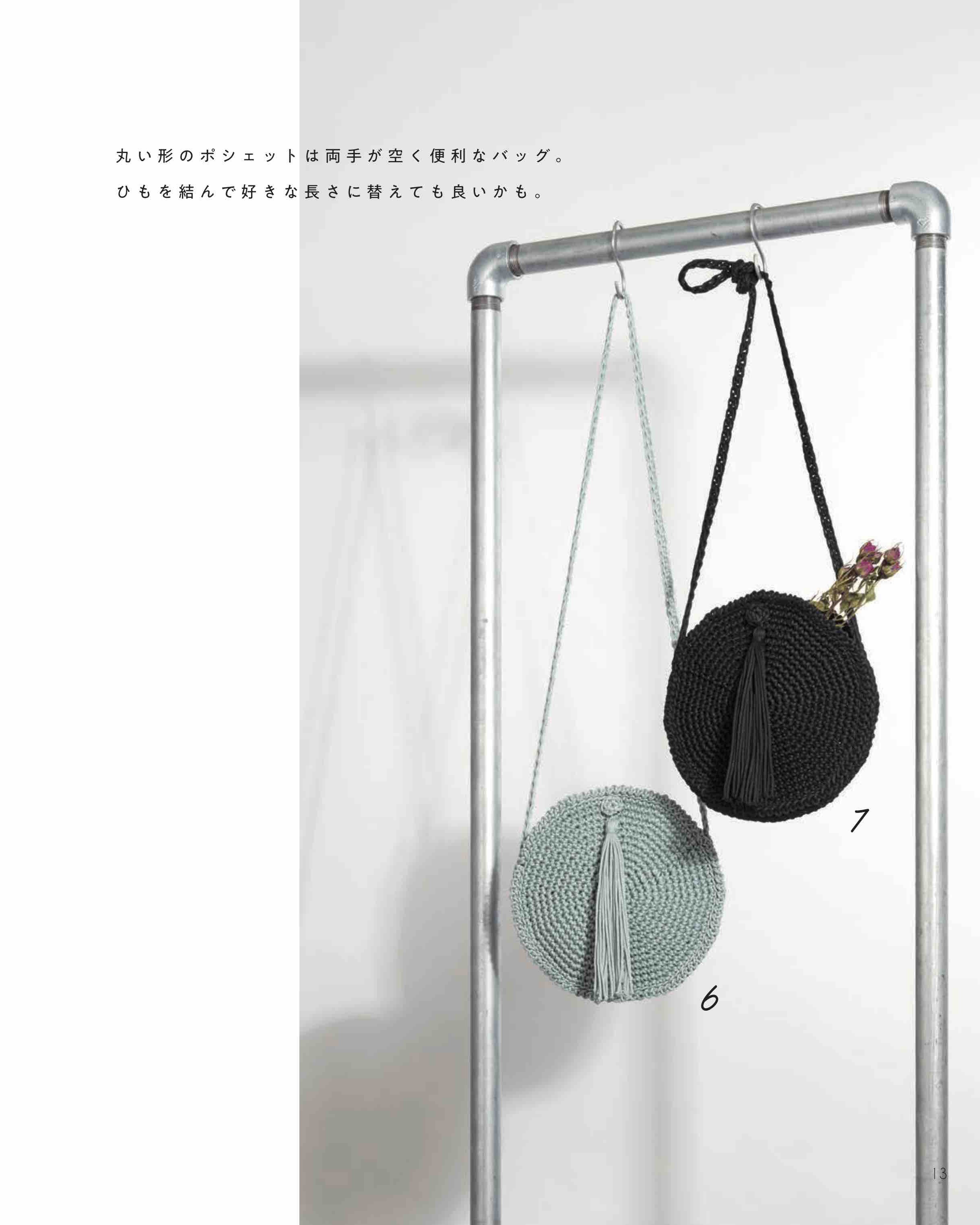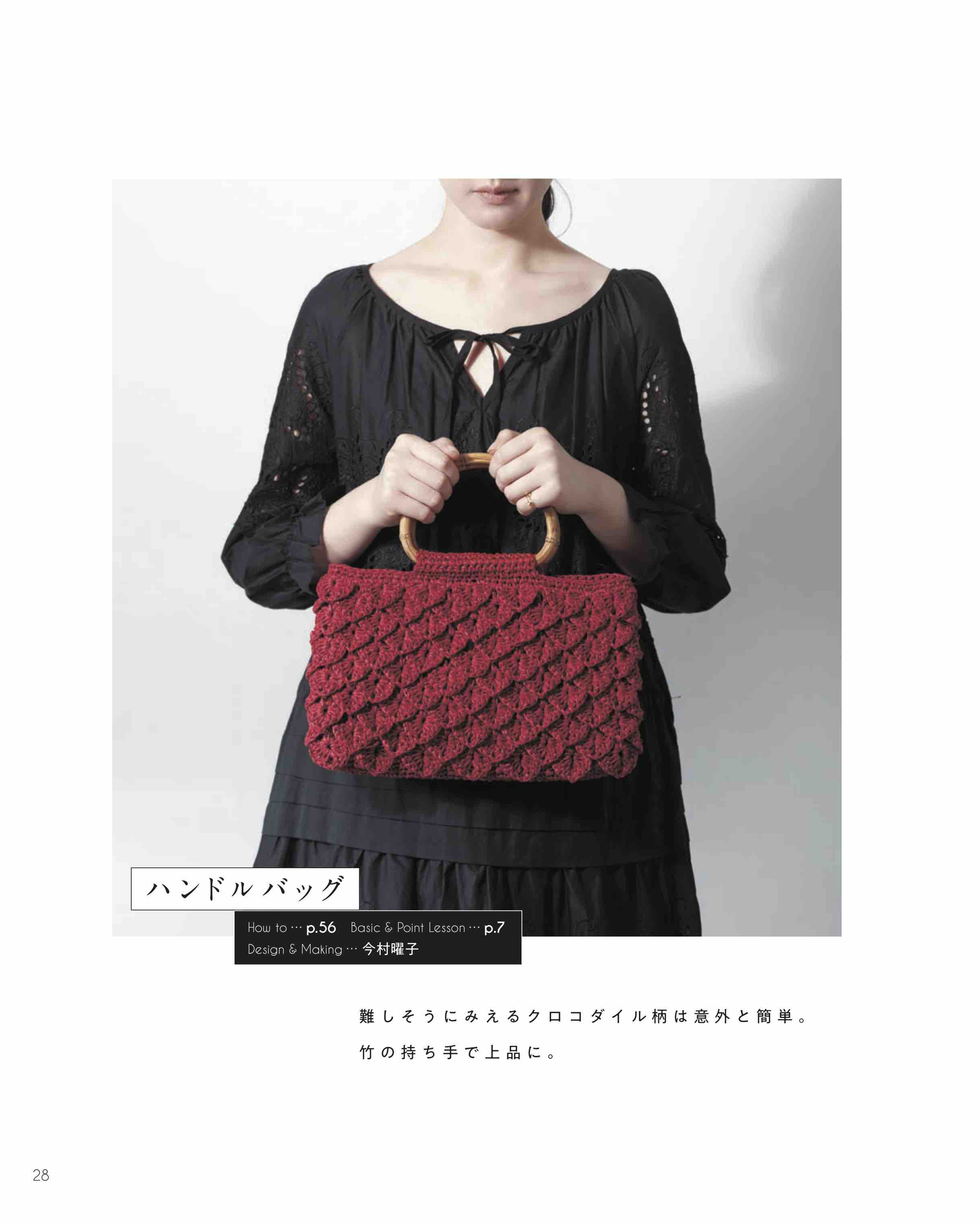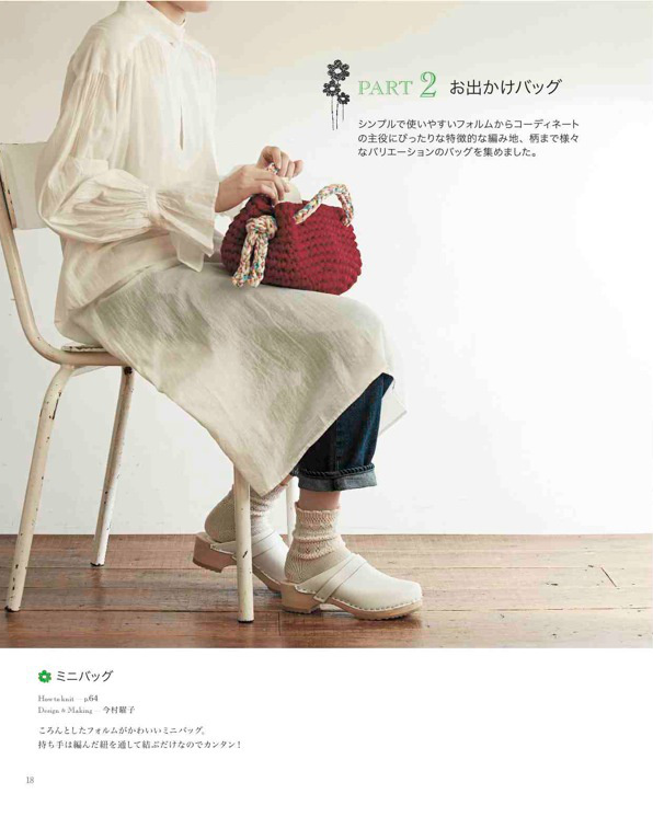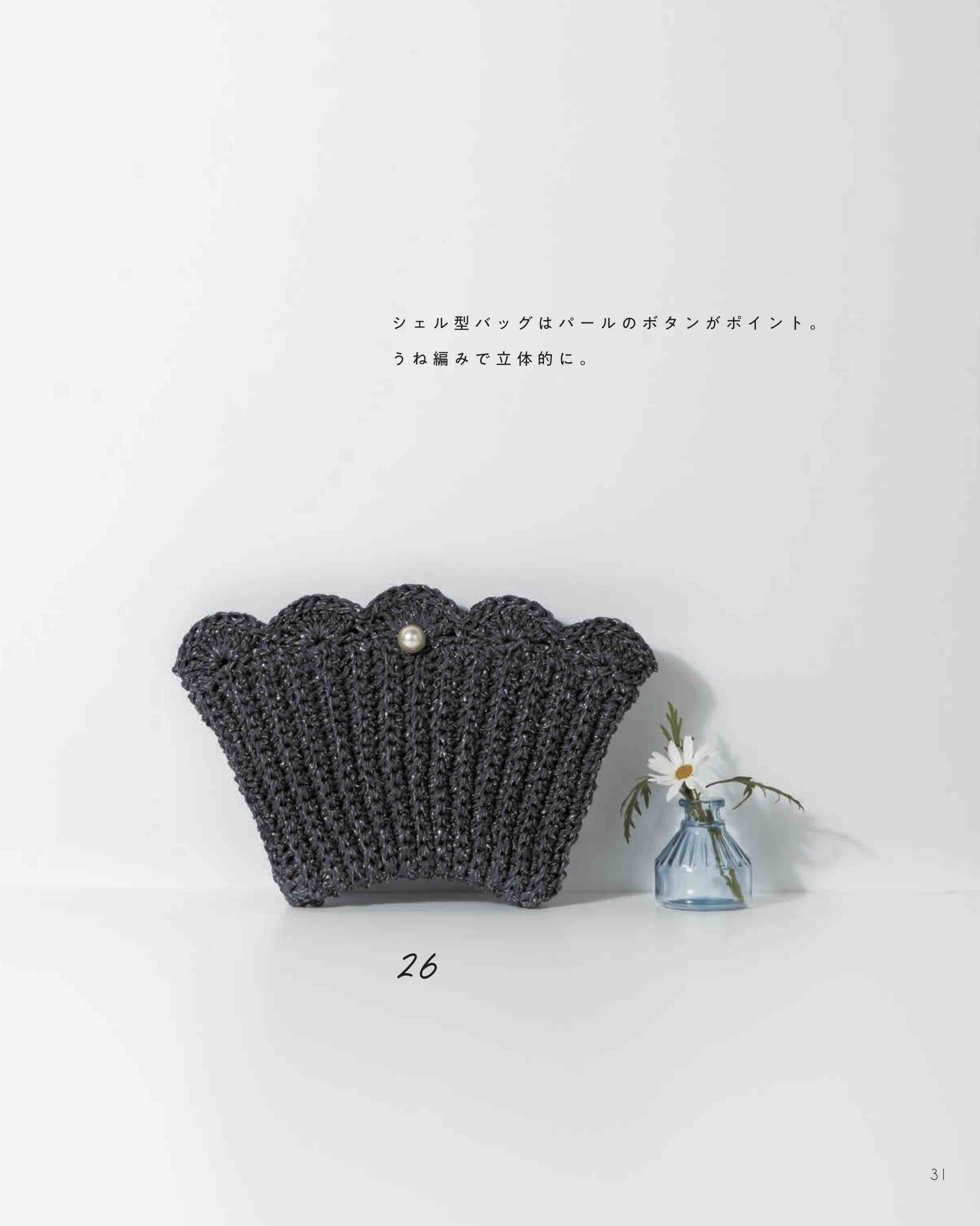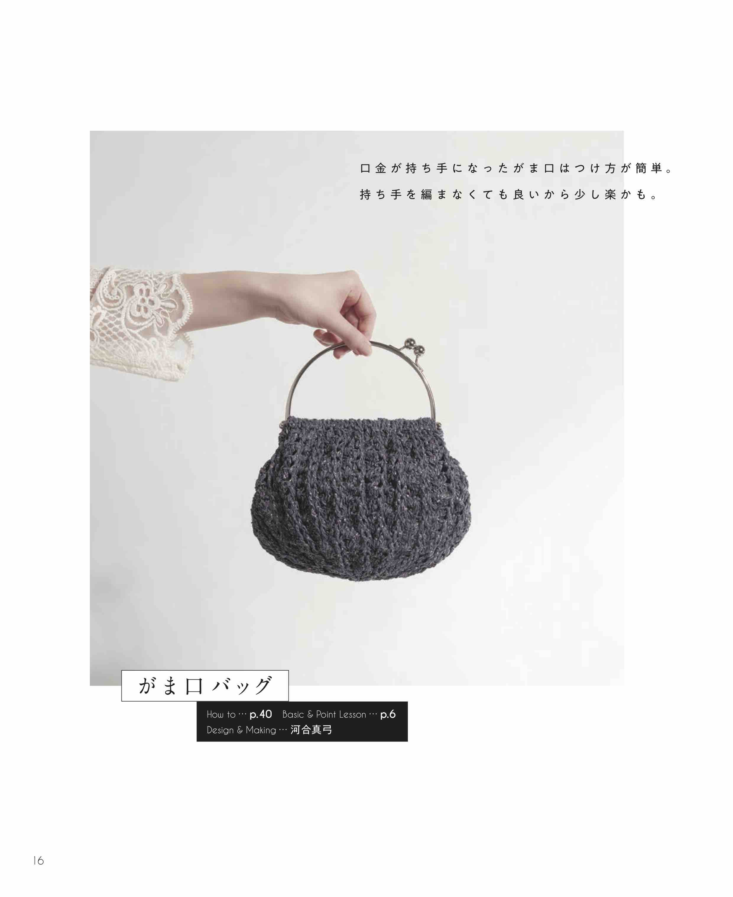 バッグの種類は、クラッチバッグ、がま口バッグ、小さめなバッグなど種類豊富に紹介。編み地もこま編みで編んだスタンダードなものや、クロコダイルパターンや玉編みなどで編み地に表情があるものまで、様々に展開。