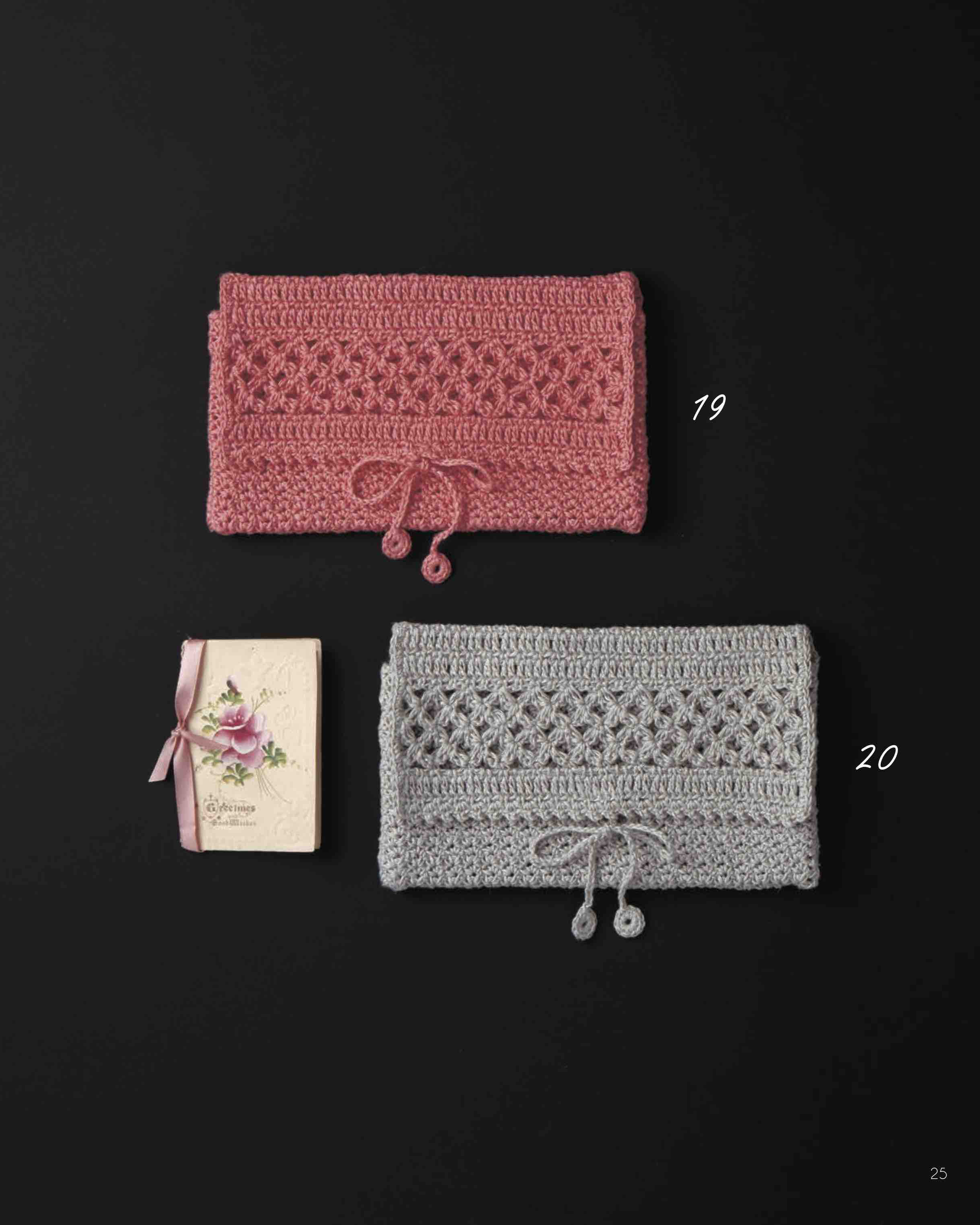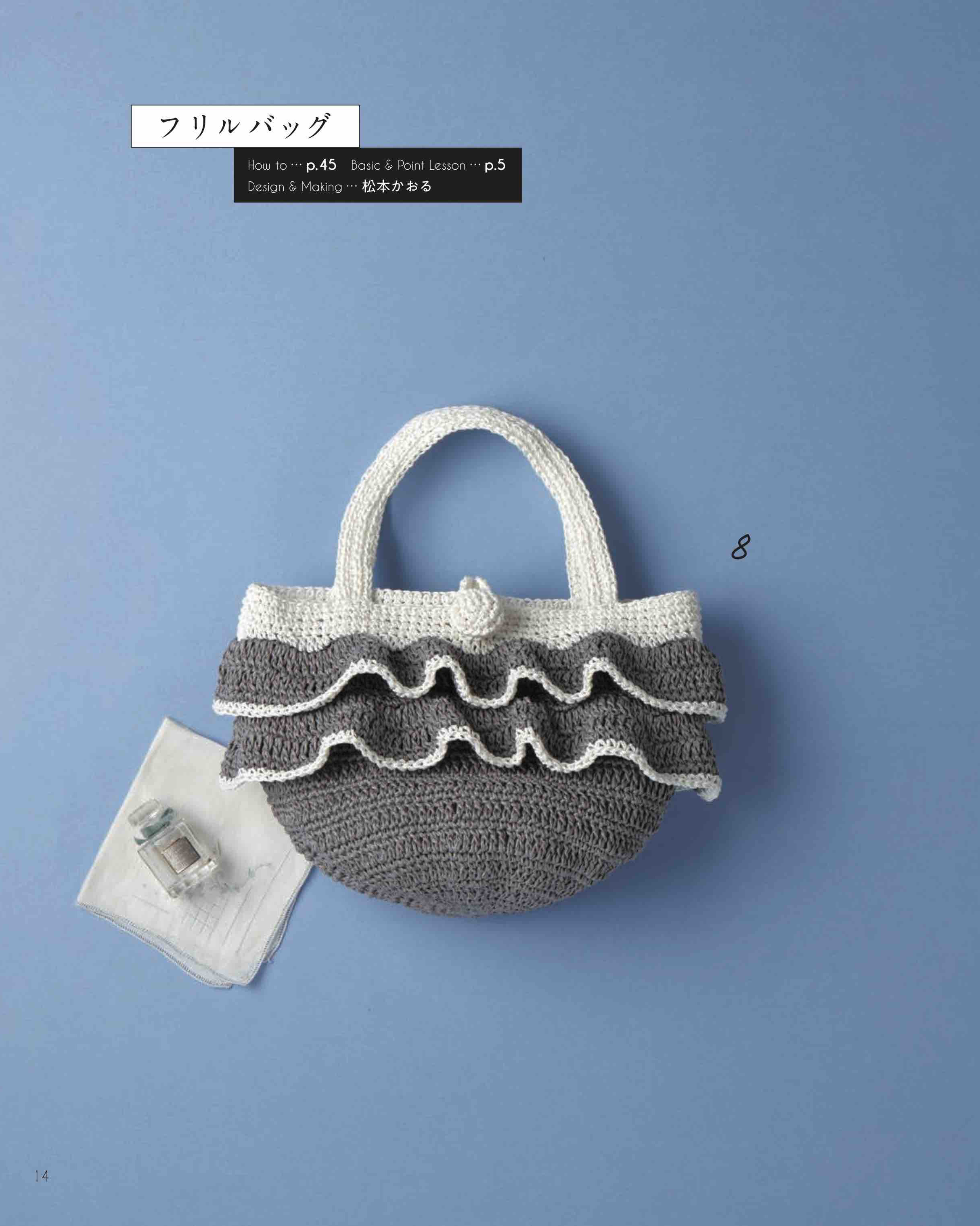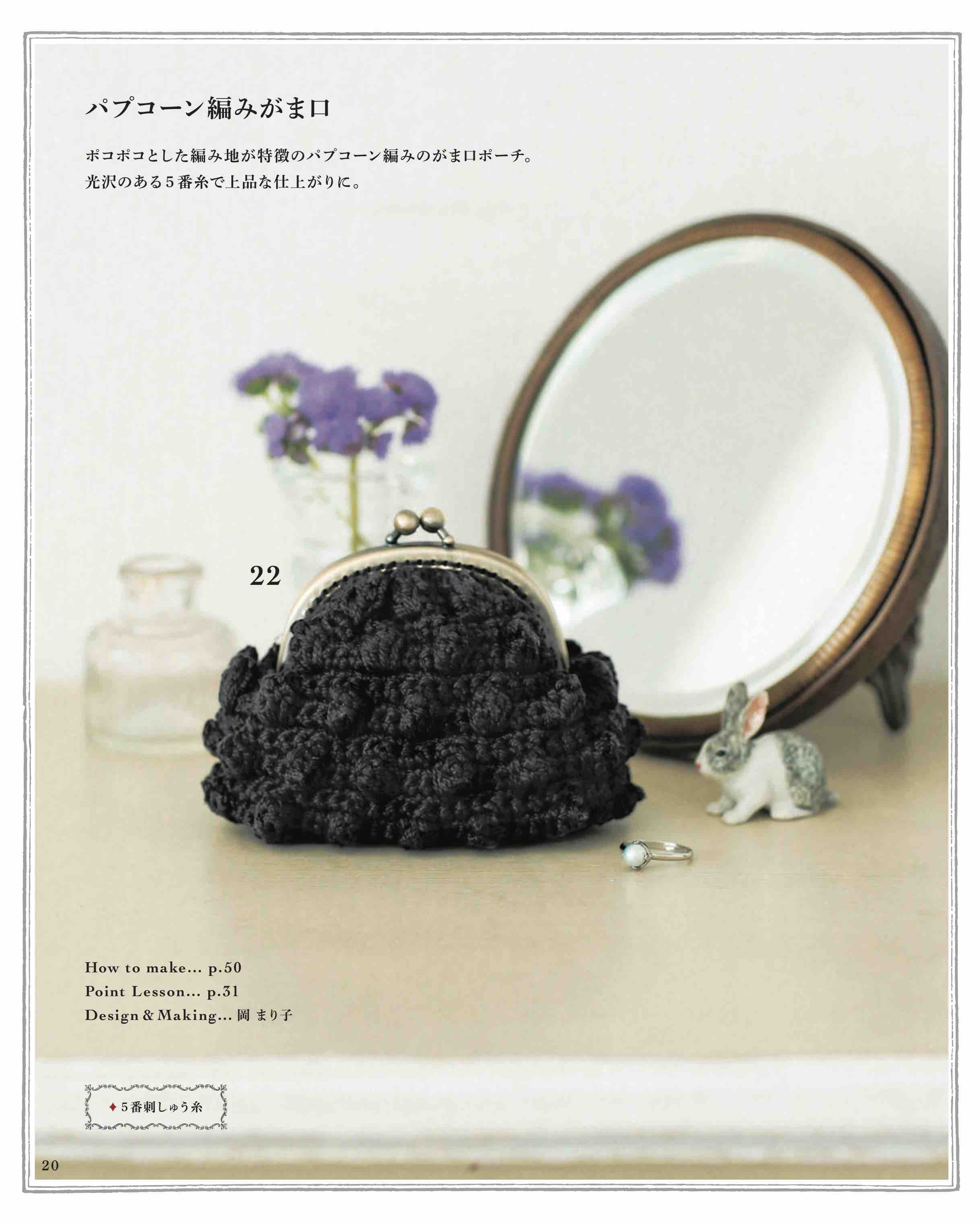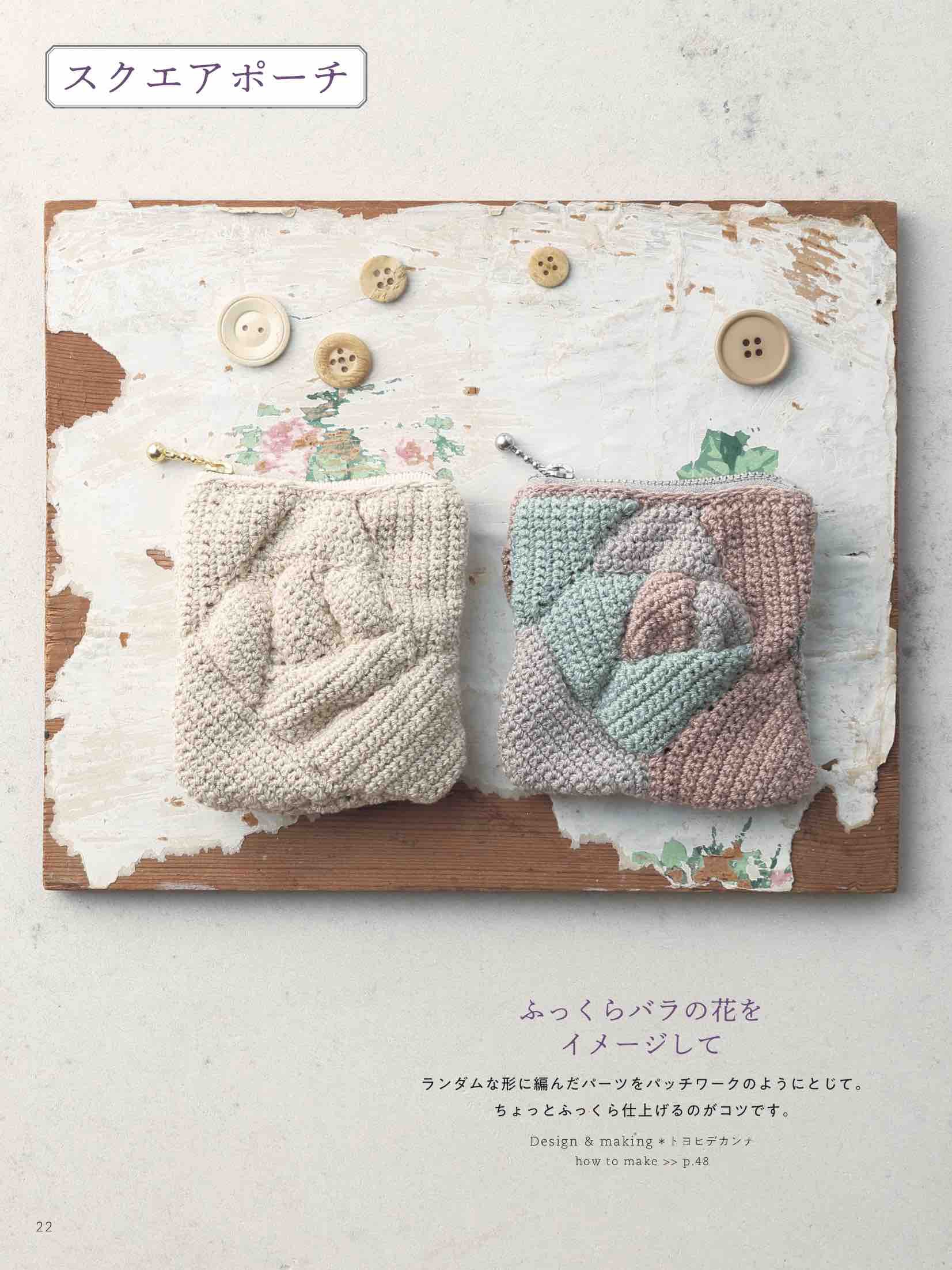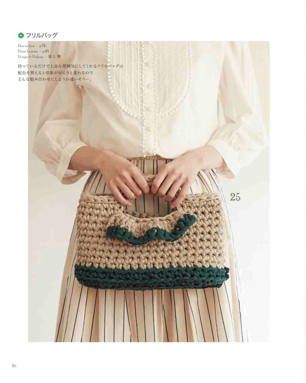 バッグの種類は、クラッチバッグ、がま口バッグ、小さめなバッグなど種類豊富に紹介。編み地もこま編みで編んだスタンダードなものや、クロコダイルパターンや玉編みなどで編み地に表情があるものまで、様々に展開。