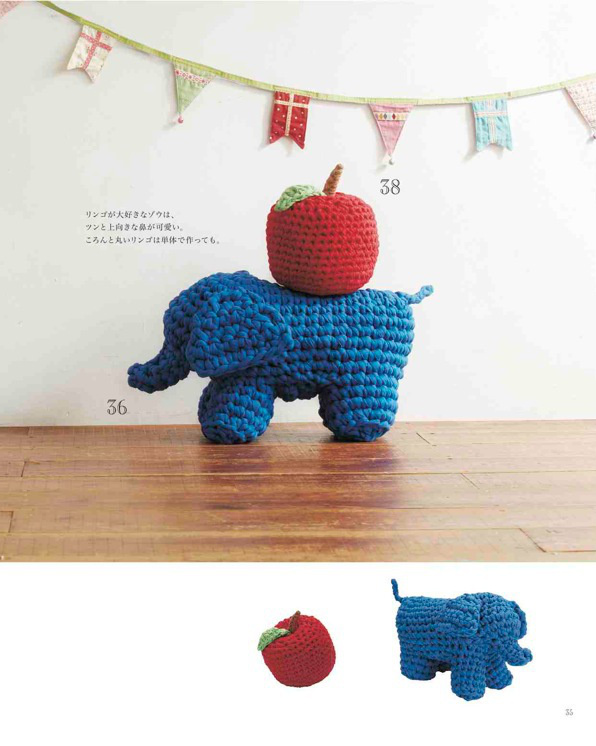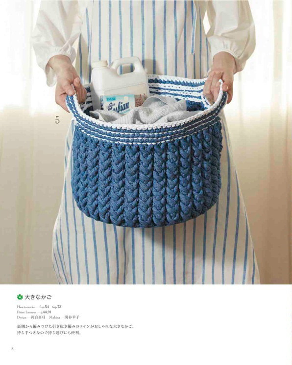 Part1のインテリア雑貨はお部屋のアクセントにぴったりなラグマットやかご、鉢植えカバーなど使い方や配色のアイデアの参考になるようなアイテムがラインナップ。Part2のお出かけバッグは、おしゃれな上にしっかりした編み地で実用的。シンプルなフォルムのトートバッグはもちろんワッフル地、編み込み模様などのアクセントの効いたアイテムも。Part3のあみぐるみはゾウ、ネコ、ウサギ、インコ、白鳥などの人気モチーフを、動物にあったこものや豊富なカラーバリエーションと共にご紹介。